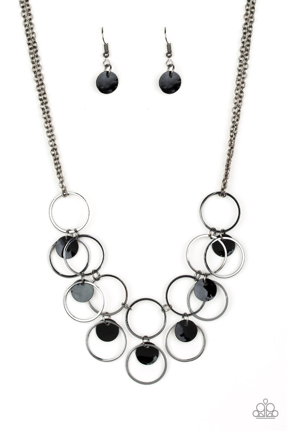 Infused with doubled gunmetal chains, a row of glistening gunmetal hoops connect below the collar. Black shell-like discs and airy gunmetal hoops swing from the bottom, creating a summery fringe. Features an adjustable clasp closure.